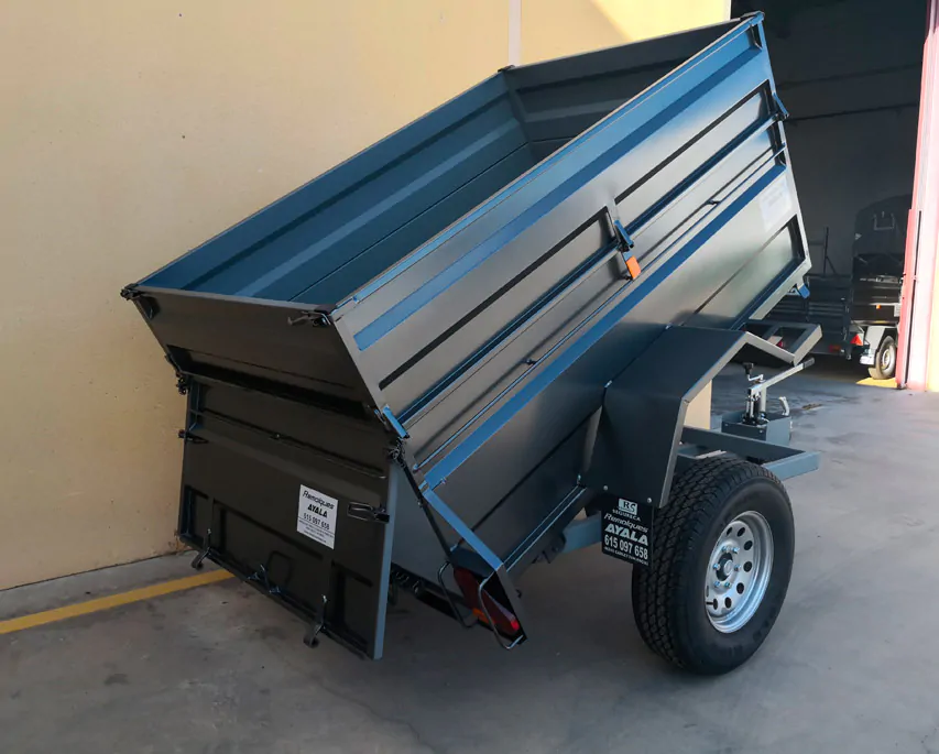 Descripción del producto: Remolque serie 4×4 reforzados, fabricado en acero negro de 1,5 y 2,0 mm completamente soldado, imprimado y pintado con pintura de poliuretano metalizada, 1 eje de 1.825 kg marca al-ko o knott (mma 750 kg), 2 ruedas 235/75 r 15″ ataque japones o 3 ruedas 185 r 14 c ataque mercedes, rueda jockey abatible de 60mm, freno de inercia y estacionamiento, basculante hidráulico bomba manual.