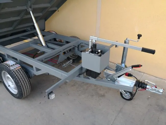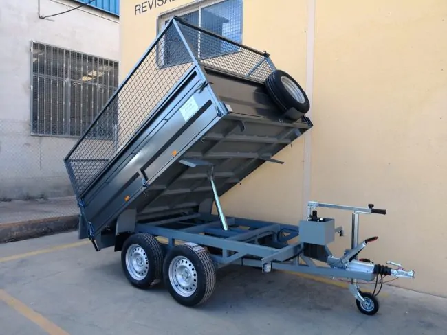 Remolque caja abierta con ruedas por debajo, 2 ejes marca alko de 1.000 kg cada uno, freno de inercia y estacionamiento, laterales abatibles y desmontables, basculante con bomba hidráulica manual, pintura metalizada, ruedas 155/80 r 13, rueda de repuesto, instalación eléctrica de 7 polos, lanza en v reforzada y rueda jockey automática.